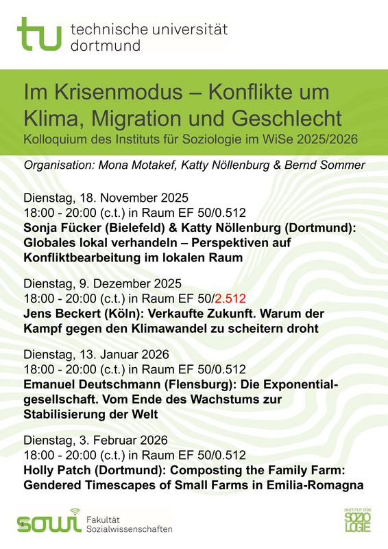 03.02.2026 18:15 - 19:45, Holly Patch (Dortmund): Composting the Family Farm: Gendered Timescapes of Small Farms in Emilia-Romagna. Lecture in the context of the colloquium of the Instutute of Sociology "Im Krisenmodus – Konflikte um Klima, Migration und Geschlecht". In room EF 50, 0.512 |